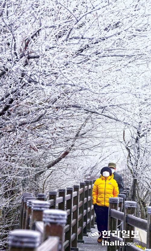 제주 일부지역 체감온도가 영하권까지 떨어진 30일 1100도로변 나무마다 하얀 상고대가 맺혀 탐방객들의 눈길을 사로잡고 있다. 강희만기자