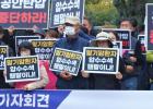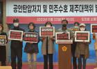 공안탄압 저지 및 민주수호 제주대책위원회 관계자들이 1일 국가인권위원회 제주출장소 앞에서 기자회견을 열고 있다.