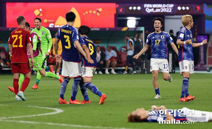 2일 오전(한국시간) 카타르 알라이얀의 칼리파 인터내셔널 스타디움에서 열린 2022 카타르 월드컵 조별리그 E조 3차전 일본과 스페인 경기. 2-1 승리를 거둔 일본의 역전골 주인공 다나카 아오(17번) 등 선수들이 경기 종료 뒤 환호하고 있다. 연합뉴스