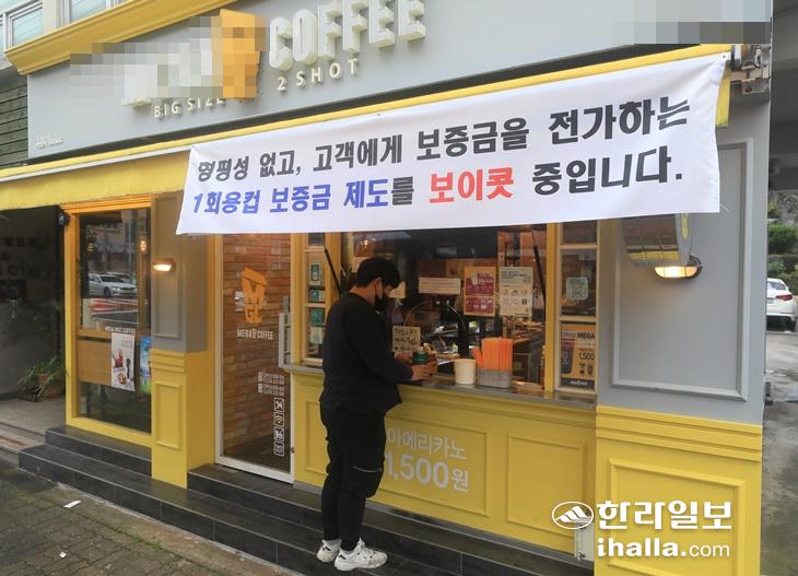 2일 오전 제주시 연동의 한 프랜차이즈 카페에 1회용컵 보증금제 보이콧 현수막이 걸려있다. 연합뉴스