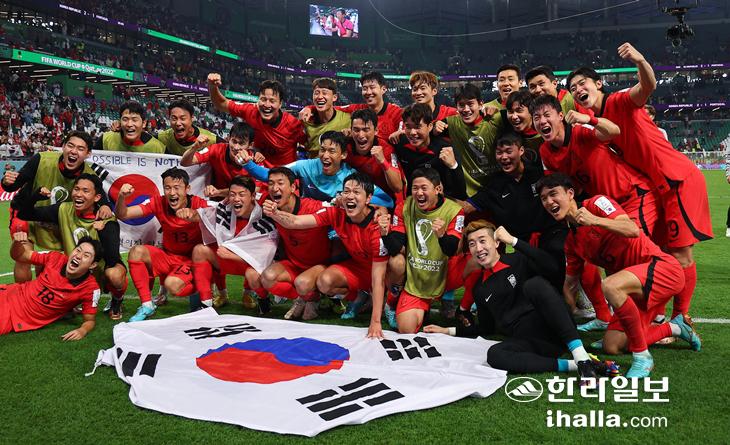 3일 오전(한국시간) 카타르 알라이얀의 에듀케이션 시티 스타디움에서 열린 2022 카타르 월드컵 조별리그 H조 3차전 대한민국과 포르투갈 경기에서 승리를 거두며 16강 진출에 성공한 대표팀 선수들이 기뻐하며 그라운드에서 기념촬영을 하고있다.연합뉴스