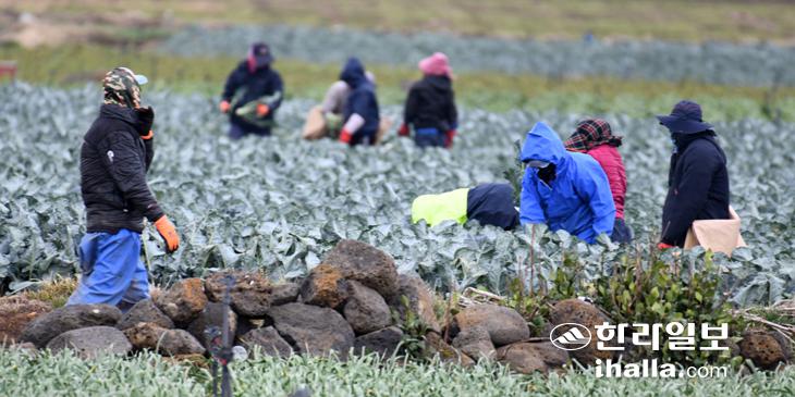 4일 서귀포시 대정읍 한 농경지에서 농민들이 추운 날씨를 이겨내며 브로콜리를 수확하고 있다. 강희만기자