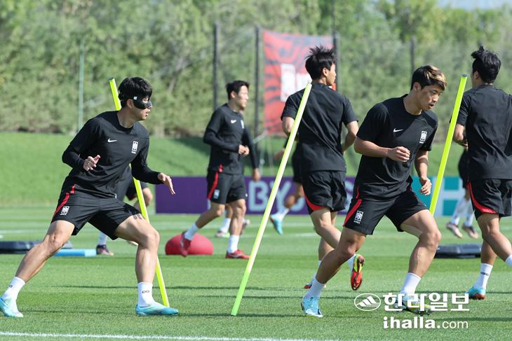 2022 카타르 월드컵 16강전 브라질과의 경기를 앞둔 축구대표팀의 손흥민, 황희찬 등 선수들이 4일 오전(한국시간) 카타르 도하 알에글라 훈련장에서 훈련하고 있다. 연합뉴스