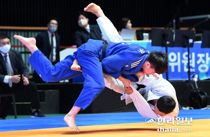 5일 한라체육관에서 열린 2022 제주컵 국제유도대회 남고부 -60kg 경기에서 오상우(남녕고, 왼쪽)가 이선준(대전체고)을 허리후리기로 한판승을 따내고 있다. 이상국 기자