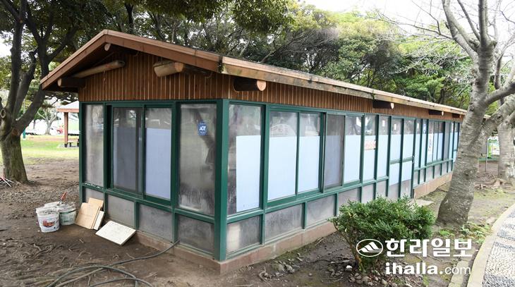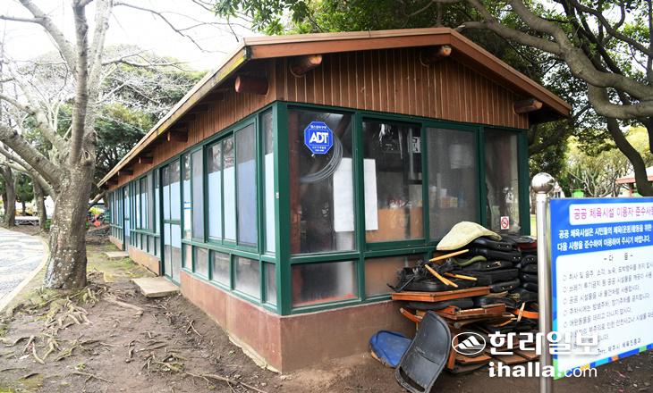 애향운동장 앞에 들어선 이른바 '애향 노인 쉼터'. 강희만기자
