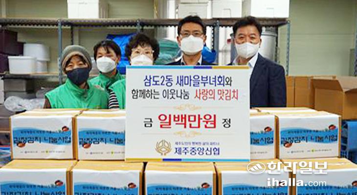 제주중앙신협(이사장 김태용)은 지난 1일 삼도2동 새마을부녀회에 이웃나눔 사랑의 맛김치 지원사업에 써달라며 후원금 100만원을 전달했다. 사랑의 맛김치 지원사업은 관내 어려운 이웃을 방문해 직접 담근 김장김치를 전달하는 사업이다.