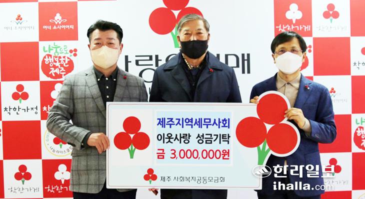 제주지역세무사회(회장 배종웅)는 지난 6일 제주사회복지공동모금회(회장 강지언) 회의실을 방문해 어려운 이웃을 위해 사용해 달라며 이웃사랑 성금 300만원을 기탁했다.