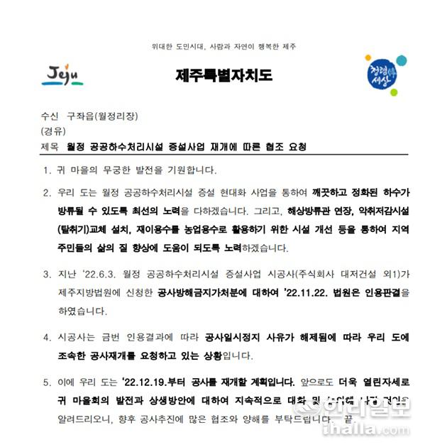 제주자치도 상하수도본부가 8일 월정리장 앞으로 발송한 공문.
