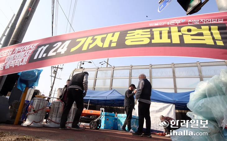 철거되는 화물연대 파업 천막과 현수막. 연합뉴스