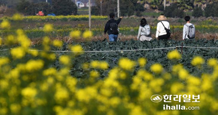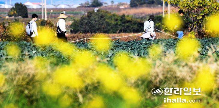 10일 서귀포시 대정읍 하모리의 농경지를 지나는 올레길에서 올레꾼들이 유채꽃을 배경으로 걸어가고 있다. 강희만기자