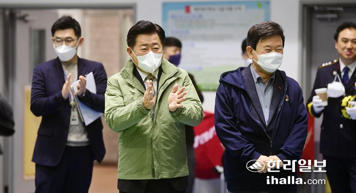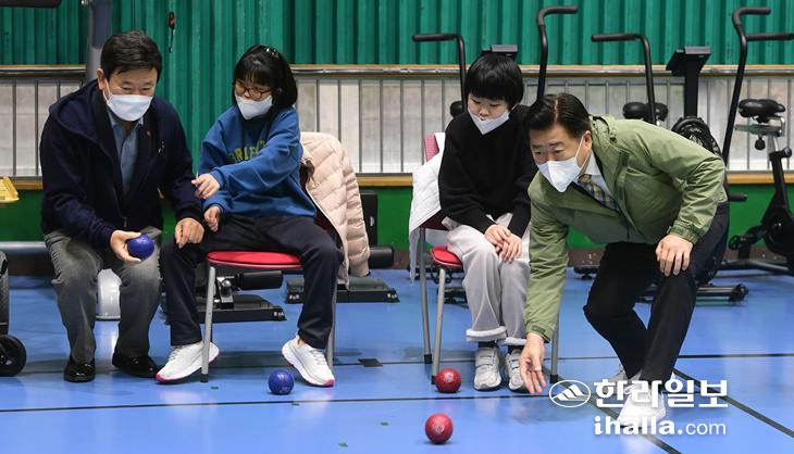 12일 김광수 제주도교육감과 오영훈 제주도지사가 공립 특수학교인 제주영지학교를 찾아 패럴림픽 정식 종목인 보치아를 함께 체험하고 있다. 제주도와 제주도교육청은 이날 제주영지학교 분교장 설치에 따른 부지 교환 등에 상호 협력하기로 했다. 강희만기자