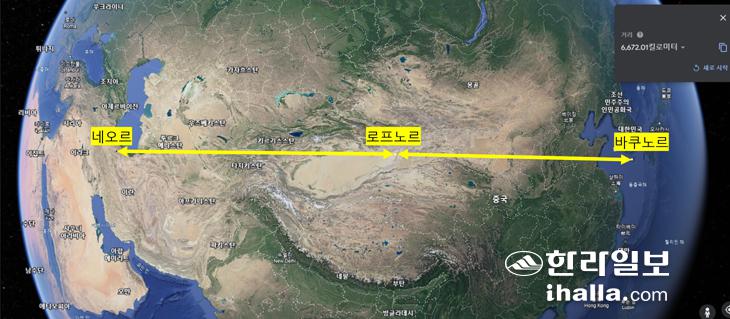 우리에겐 먼 나라의 전설처럼 들리는 이 호수는 제주도에서 서쪽으로 3300㎞ 떨어져 있다. 지난 회에 설명한 이란의 네오르 호(Neor Lake)는 이란 북서부 아제르바이잔과의 국경 근처 바그루 산맥의 아르다빌에서 48㎞ 떨어진 곳에 있는 호수다. 카스피해 연안이라고 보면 된다. 이 호수는 로프노르 호수에서 또다시 서쪽으로 3300㎞ 떨어진 곳에 있다. 그러므로 제주도에서 보면 약 6600㎞ 서쪽에 있는 것이다. 호수의 의미로 노르라고 쓰는 곳은 몽골을 중심으로 한 거의 아시아 전역이다. 아마 '바쿠노르'는 그중 최동단일 것이다.