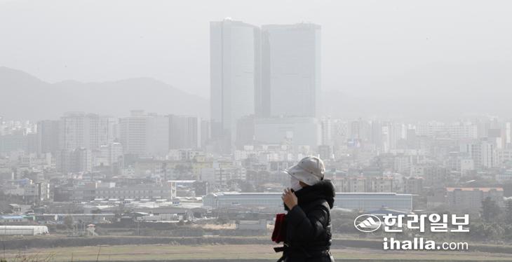 13일 제주시 미세먼지농도가 짙어져 나쁨상태인 가운데, 도두봉에서 바라 본 제주시내가 미세먼지로 뿌옇게 둘러쌓여 있다. 이상국기자
