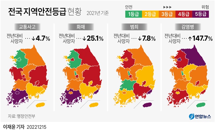 행정안전부는 전국 지방자치단체의 안전수준을 나타낸 2021년 지역안전지수를 15일 발표했다.