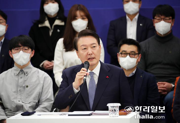 윤석열 대통령이 15일 서울 청와대 영빈관에서 열린 제1차 국정과제 점검회의를 주재하고 있다. 연합뉴스
