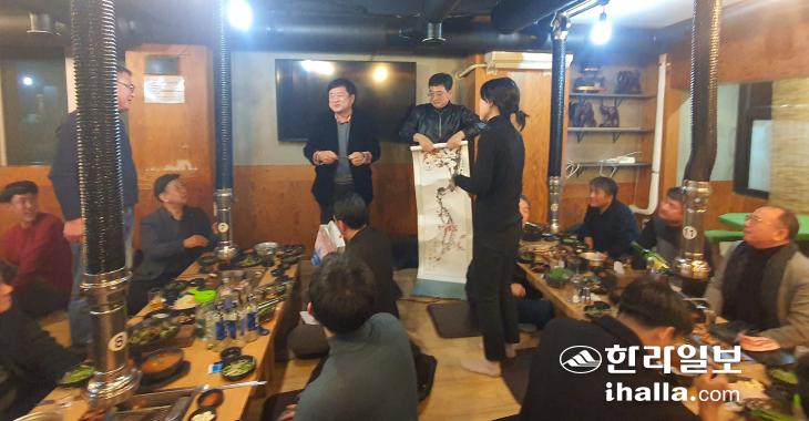 지난 15일 제주시 오라1동 서흘포가든에서 열린 한라일보 '2022 송년의 밤' 행사에서 고광언 본보 독자권익위원장이 독자권익위가 수여하는 기자상을 전달하고 있다. 이상국기자