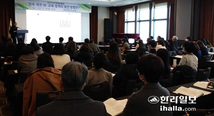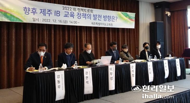 이번 토론회는 현재 'IB 월드 스쿨'로 불리는 IB 인증학교를 포함 총 12개 학교(초 9개교, 중 2개교, 고 1개교)에서 IB 교육 프로그램을 운영 중인 도교육청에서 '향후 제주 IB 교육 정책의 발전 방향'을 주제로 처음 IB 정책을 다룬 자리였다. 이무성 연세대 교육학과 교수가 'IB 교육과정 실행상의 문제점과 공교육 도입에 대한 쟁점 논의-IBDP를 중심으로'에 대해 발제했고 강동우 제주도의회 교육의원, 강현석 경북대학교 사범대학 교수, 우옥희 전 중등교장, 이혜정 교육과혁신연구소장, 손민호 인하대학교 교육대학원장이 토론을 맡았다.