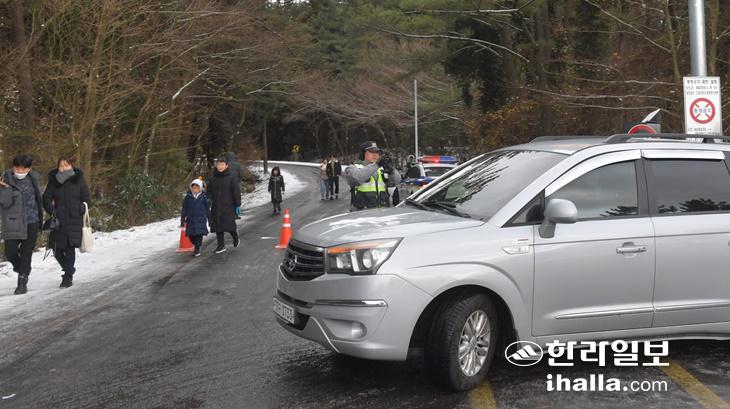 대설특보가 내려진 17일 제주시 어승생삼거리 1100도로 입구에 소형차량 통제로 차량들이 경찰의 안내를 받고있다. 이날 오후 2시30분 기준 한라산 삼각봉 14.5㎝, 어리목 8.8㎝, 한라생태숲 4㎝, 산천단 0.5㎝의 적설량을 보이고 있다. 이상국기자
