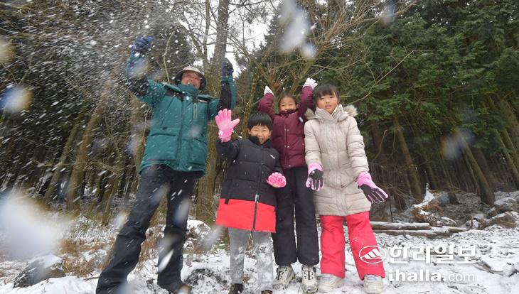 제주산지와 중산간에 대설주의보가 내려진 17일 제주시 아흔아홉골 입구에서 시민들이 눈놀이를 하고 있다. 이상국기자