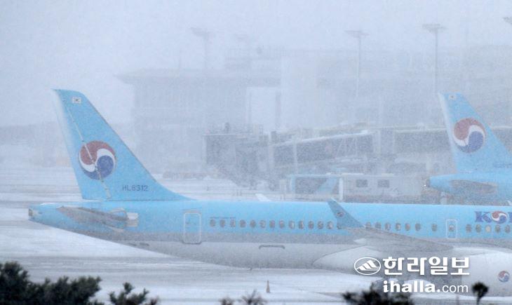 18일 오전 폭설로 인해 멈춰선 제주국제공항. 강희만기자
