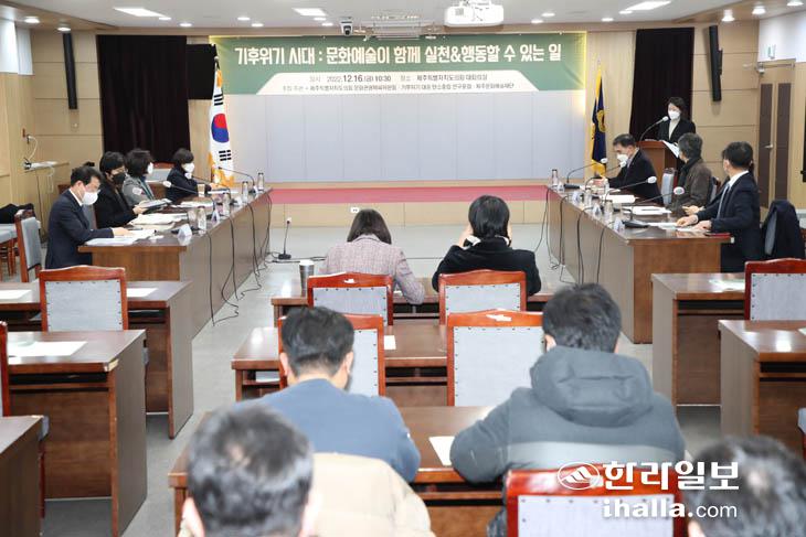 제주도의회 문화관광체육위원회가 지난 16일 제주도의회 대회의실에서 '기후위기시대 : 문화예술이 함께 실천&행동 할 수 있는 일'을 주제로 토론회를 개최하고 기후위기 속 문화예술의 역할 등을 논의했다.
