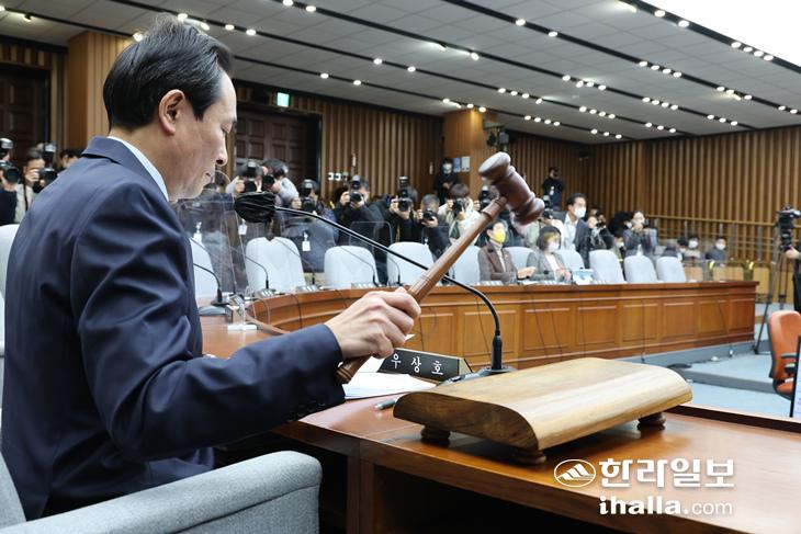 19일 국회에서 열린 '이태원 참사' 국정조사 특별위원회 전체회의에서 우상호 위원장이 국민의힘 의원들이 불참한 가운데 의사봉을 두드리고 있다. 연합뉴스