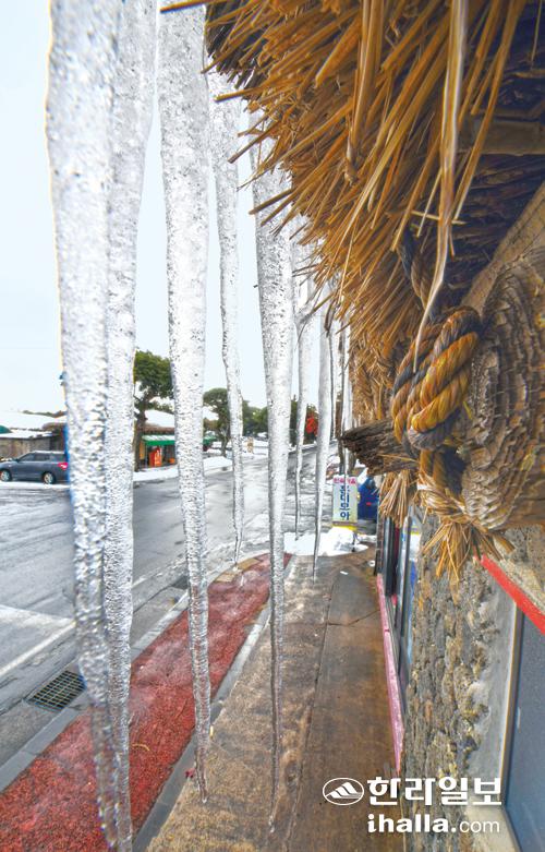 한파가 계속된 19일 오전 서귀포시 표선면 성읍민속마을 초가집 처마에 고드름이 매달려 지나는 이들의 시선을 끌고 있다. 강희만기자