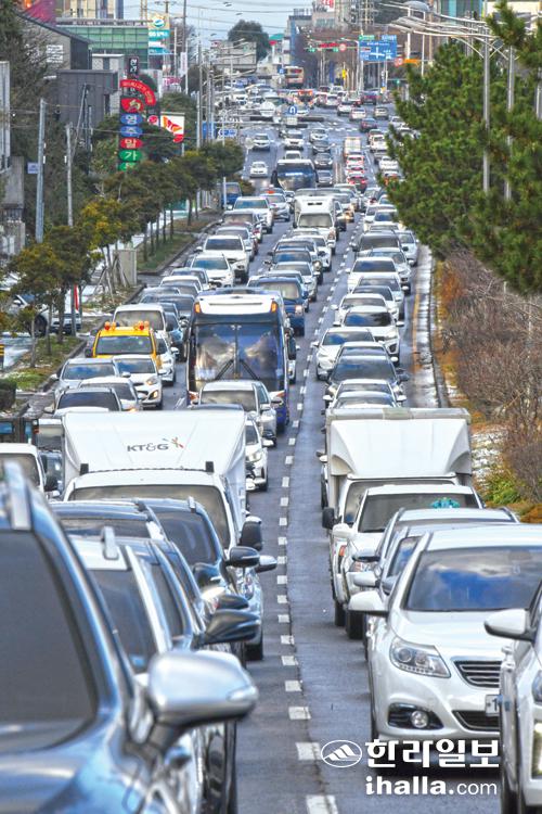 강추위가 이어진 19일 오전 제주시 연북로에 출근길 차량들이 몰리면서 거북이 운행을 하고 잇다. 강희만기자