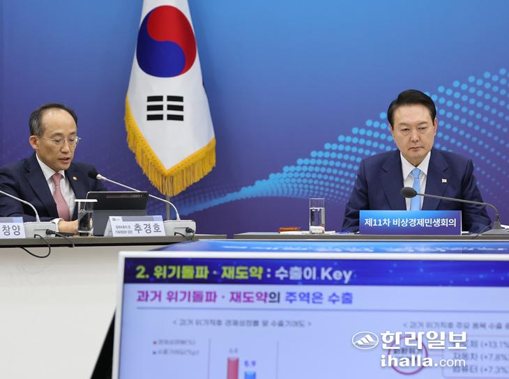 윤석열 대통령이 지난 10월 27일 오후 서울 용산 대통령실 청사에서 열린 제11차 비상경제민생회의에서 추경호 경제부총리 겸 기획재정부 장관의 발제를 듣고 있다. 연합뉴스