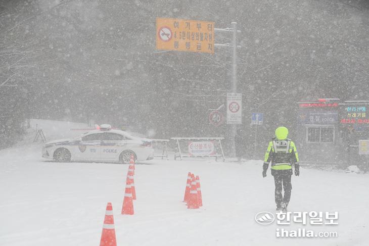 22일 많은 눈이 내리는 1100도로 어승생 입구. 연합뉴스