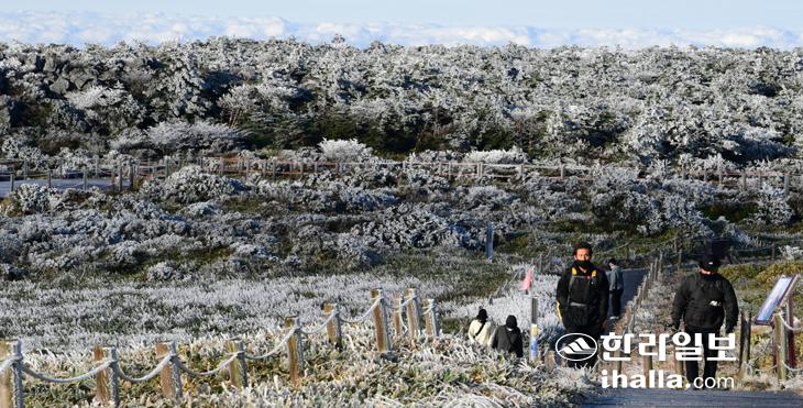 지난겨울 눈 쌓인 한라산 영실 탐방로를 오르는 등산객들의 모습. 한라일보DB