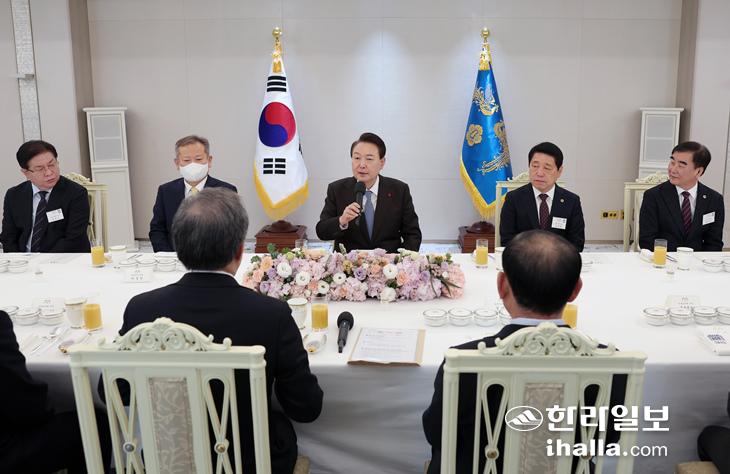 윤석열 대통령이 22일 서울 용산 대통령실 청사에서 시도의회의장협의회 임원진과 오찬 간담회를 하고 있다. 대통령실 제공