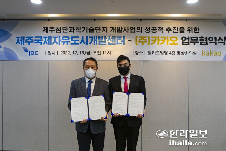 JDC와 (주)카카오가 지난 16일 '제주첨단과학기술단지 내 카카오 부지 개발사업의 성공적 추진을 위한 양해각서'를 체결하고 있다.