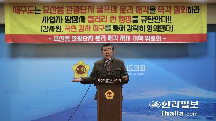묘산봉관광단지 분리매각 저지 대책위원회가 26일 제주도의회에서 기자회견을 열고 있다. 김도영기자