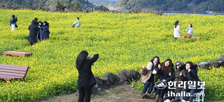 [한라일보] 극심한 한파가 지나간 27일 서귀포시 성산읍 한 유채꽃 밭을 찾은 관광객들이 기념사진을 찍으며 제주의 겨울을 만끽하고 있다.