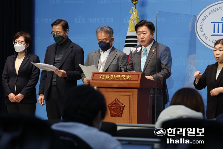 오영훈 제주특별자치도지사가 28일 오전 국회 소통관에서 제주공항 용역보고서 즉각공개와 군사공항화 반대 기자회견을 하고 있다. 연합뉴스