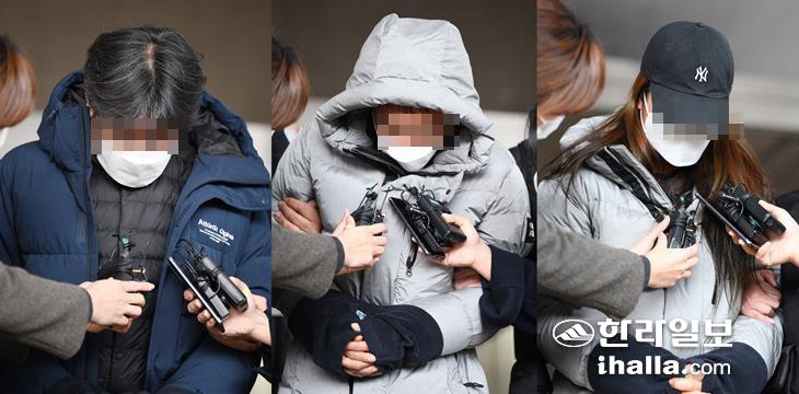 제주 유명식당 대표 살해 피의자들이 28일 검찰에 송치됐다. 사진 왼쪽부터 범행을 지시한 혐의를 받는 박씨와 피해자를 직접한 살해한 김씨, 김씨의 아내 이씨. 이상국 기자