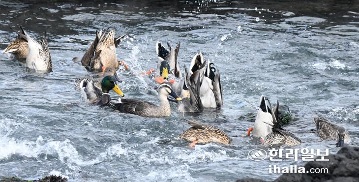 27일 제주시 구좌읍 평대리 바다에서 오리들이 물속에 머리를 넣고 먹이를 찾고 있다. 이상국기자