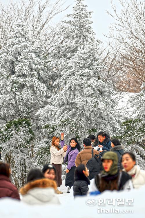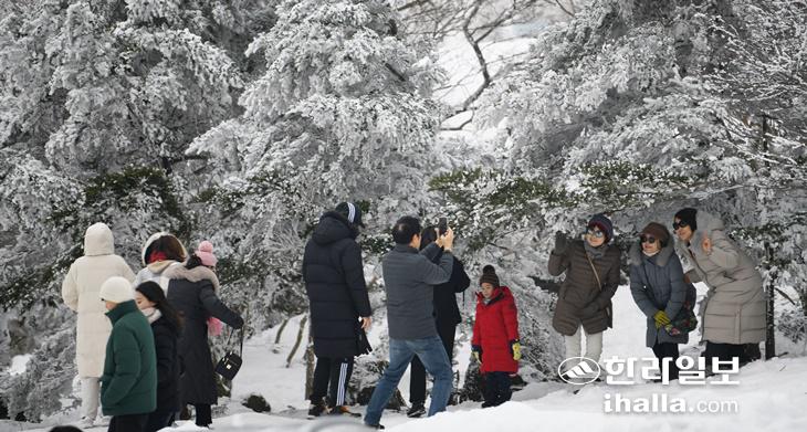 [한라일보] 28일 한라산 1100고지를 찾은 관광객들이 아름다운 상고대를 배경으로 기념사진을 촬영하며 추억을 새기고 있다. 이상국기자