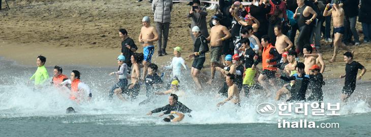 [한라일보] 1일 서귀포시 중문색달해수욕장에서 열린 제24회 서귀포 겨울바다 국제펭귄수영대회 참가자들이 바다로 뛰어가고 있다. 코로나19로 3년만에 열린 이번 행사에는 제주도민과 관광객 등 500여명이 참가해 저마다 묵은 해의 시름을 바다에 던져버리고 새해 소원을 빌었다.