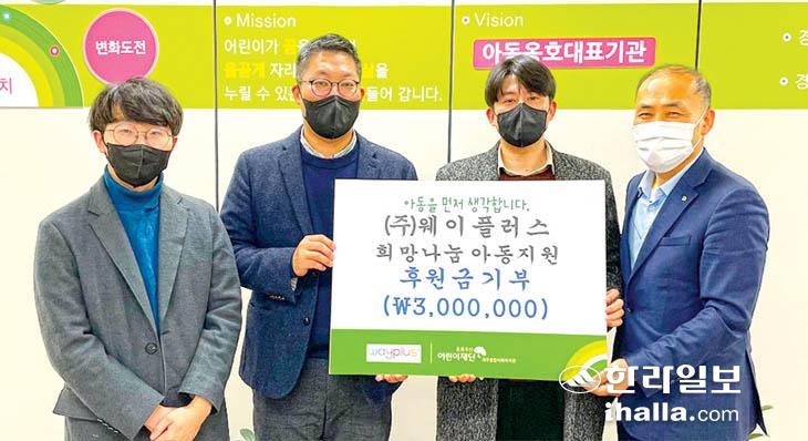 스마트 관광 전문기업 (주)웨이플러스(대표 강봉조)는 지난달 30일 초록우산 어린이재단 제주종합사회복지관(관장 김희석)을 찾아 저소득가정 아동과 희망을 나누기 위한 후원금 300만원을 기부했다.
