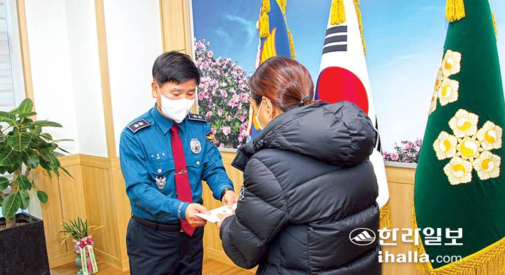제주경찰청(청장 이상률)은 지난달 30일 '2022년 교통사고 줄이기 한마음대회 대통령 표창(단체)' 시상금 500만원을 경제적 지원이 필요한 교통사고 피해자에게 전달했다.