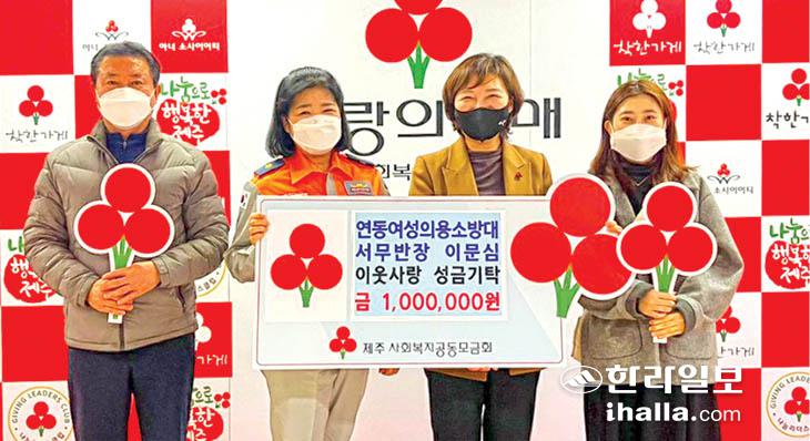 제주소방서 연동 여성 의용소방대(대장 김정희) 소속 이문심 서무반장은 지난달 27일 사랑의열매 제주사회복지공동모금회를 방문해 연동 관내 어르신 돕기 성금 100만원을 전달했다. 연동의용소방대는 현장 보조업무, 소방시설 설치 등 봉사활동을 수행하고 있다.
