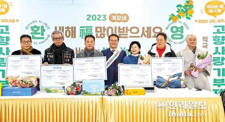 이날 관광을 위해 제주를 찾은 방문객 중 5명이 사전에 고향사랑기부 의사를 밝혔다. 손동우 한국미술협회 정무부이사장, 현석 탤런트, 박보근 탤런트, 장훈 국민재난안전총연합회장, 차혜숙 궁중코리아총회장 등이다. 이중 배우 현석 씨가 고향사랑기부제 1호로 이름을 올리게 됐다.