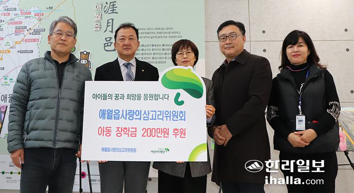 애월읍사랑의삼고리위원회(위원장 박성필)는 지난달 29일 제주시 애월읍사무소(읍장 양행석)에서 초록우산 어린이재단 제주지역본부(본부장 박정숙)에 아동 장학금 200만원을 기부했다.