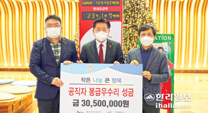 제주특별자치도 공직자 일동은 지난달 29일 제주도청 로비에서 봉급우수리 성금 3050만원을 제주사회복지공동모금회(회장 강지언)에 기탁했다.