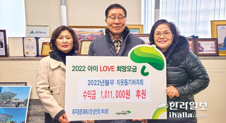 제주시 동문재래시장상인회(회장 김원일)와 부녀회(회장 박해례)는 지난달 30일 초록우산 어린이재단 제주지역본부(본부장 박정숙)에 불우이웃돕기 바자회 수익금 101만1000원을 후원했다.