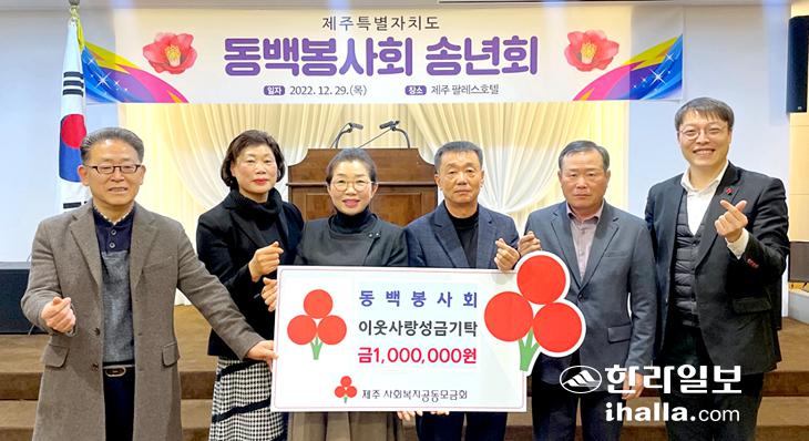 제주특별자치도 동백봉사회(회장 조옥향)는 지난달 29일 제주 팔레스호텔에서 송년회 행사를 갖고 이웃사랑 성금 100만원을 제주사회복지공동모금회(회장 강지언)에 기탁했다.