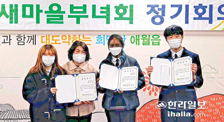 애월읍새마을부녀회(회장 김신자)는 지난 2일 제주시 애월읍사무소 대회의실에서 회원 27명이 참여해 모범적인 관내 중학생 3명에게 장학증서를 전달했다.