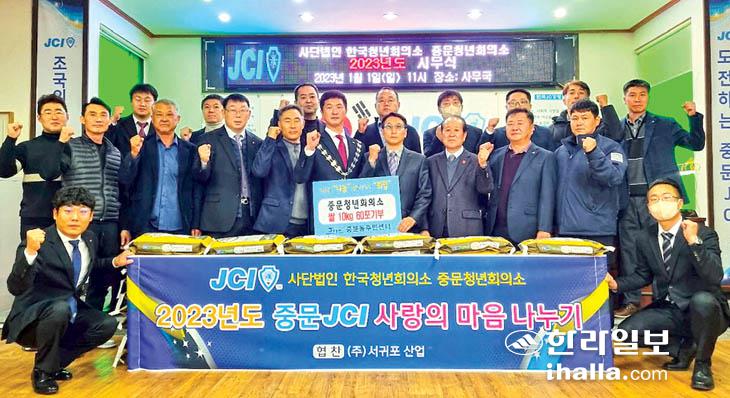 중문청년회의소(회장 김영찬)는 지난 1일 시무식과 사랑의 마음 나누기 행사를 열고 사회적으로 소외돼 있는 지역 내 취약계층을 위한 사랑의 쌀 10㎏ 60포(200만원 상당)를 기부했다.